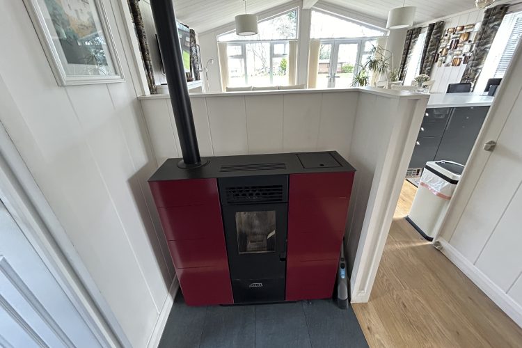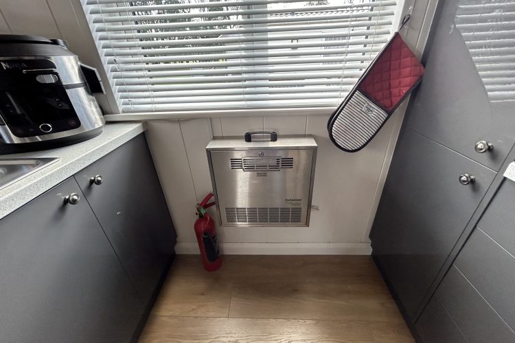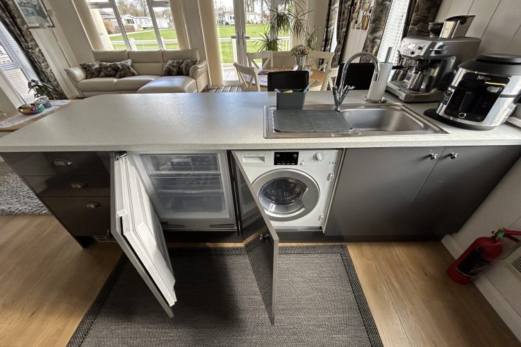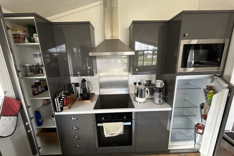 This lovely lodge, positioned to the rear of Merley House overlooking the main lawn comes completely furnished and ready to move into. You can park directly outside the lodge and enter it by going up onto the side decking and through the side door. Immediately to either side of you are cupboards, one housing the central heating and hot water LPG combi boiler and the other for coats, hats, and wellies. Next to this is a pellet fed heater which provides additional heating for the whole lodge. You then enter into the vast open plan kitchen/dining lounge area. With two sets of double opening doors and above these glass panels, it is extremely light and airy, even on the dullest of days. There is a fully equipped compact kitchen with a large integrated fridge, under counter freezer, washer/dryer and electric cooker and hob.