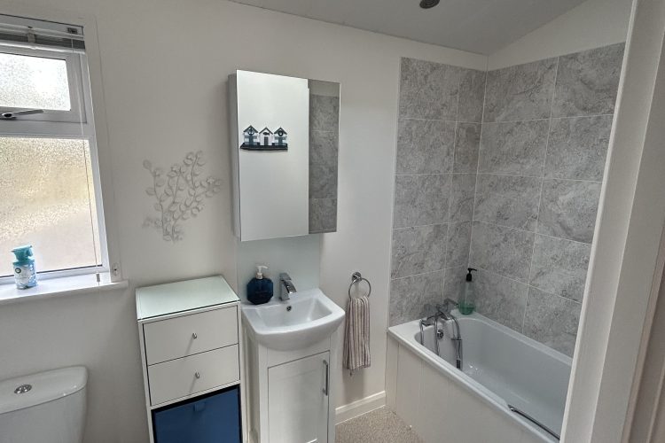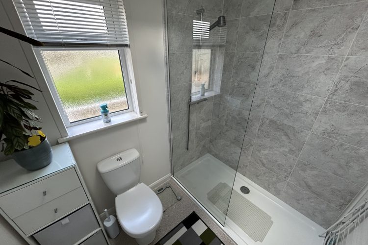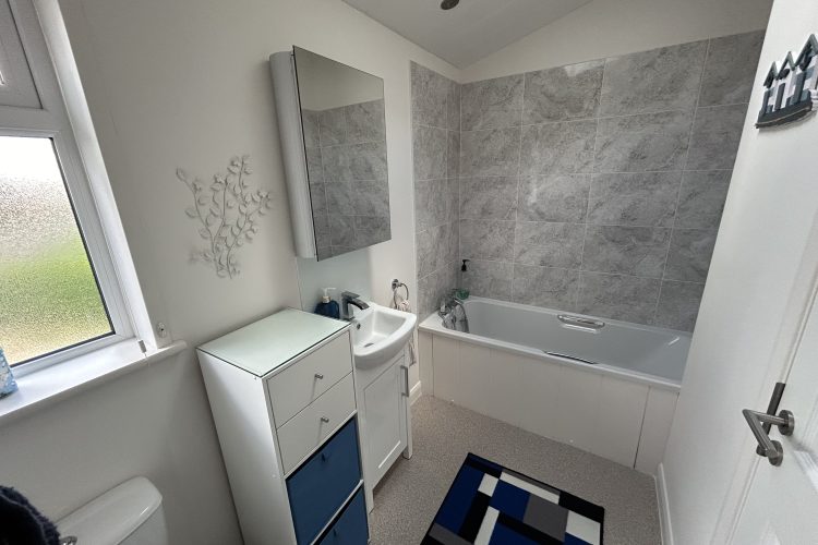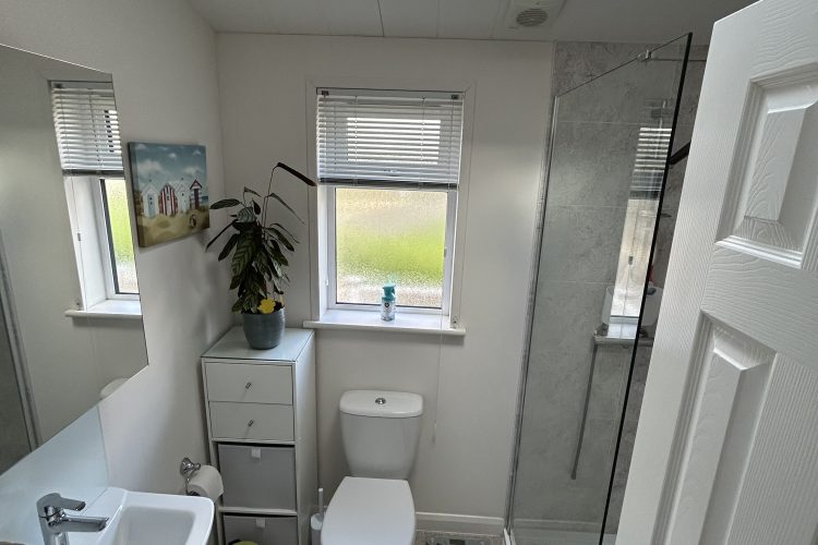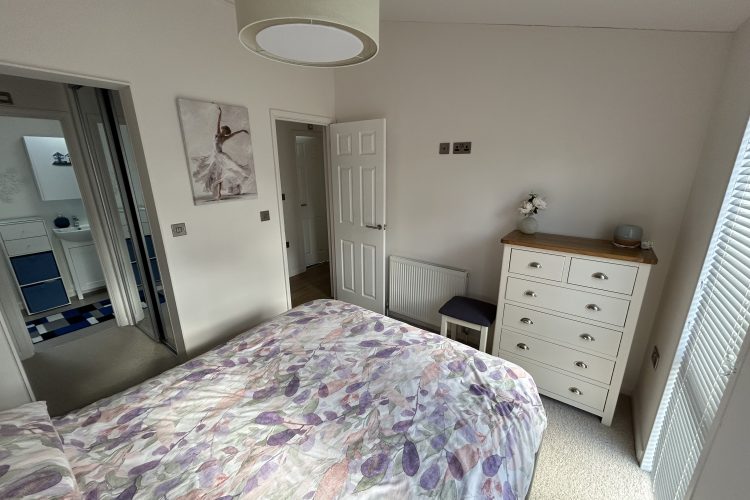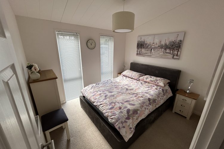 Head down the lodge towards the bedrooms, a twin bedroom on your left comes with two single beds and headboards, and a built in wardrobe, and small unit between the beds. Directly opposite this bedroom there is the main bathroom with a large walk in shower, toilet, wash hand basin and heated towel rail. There is also a velux window in the roof.